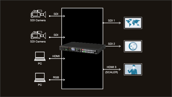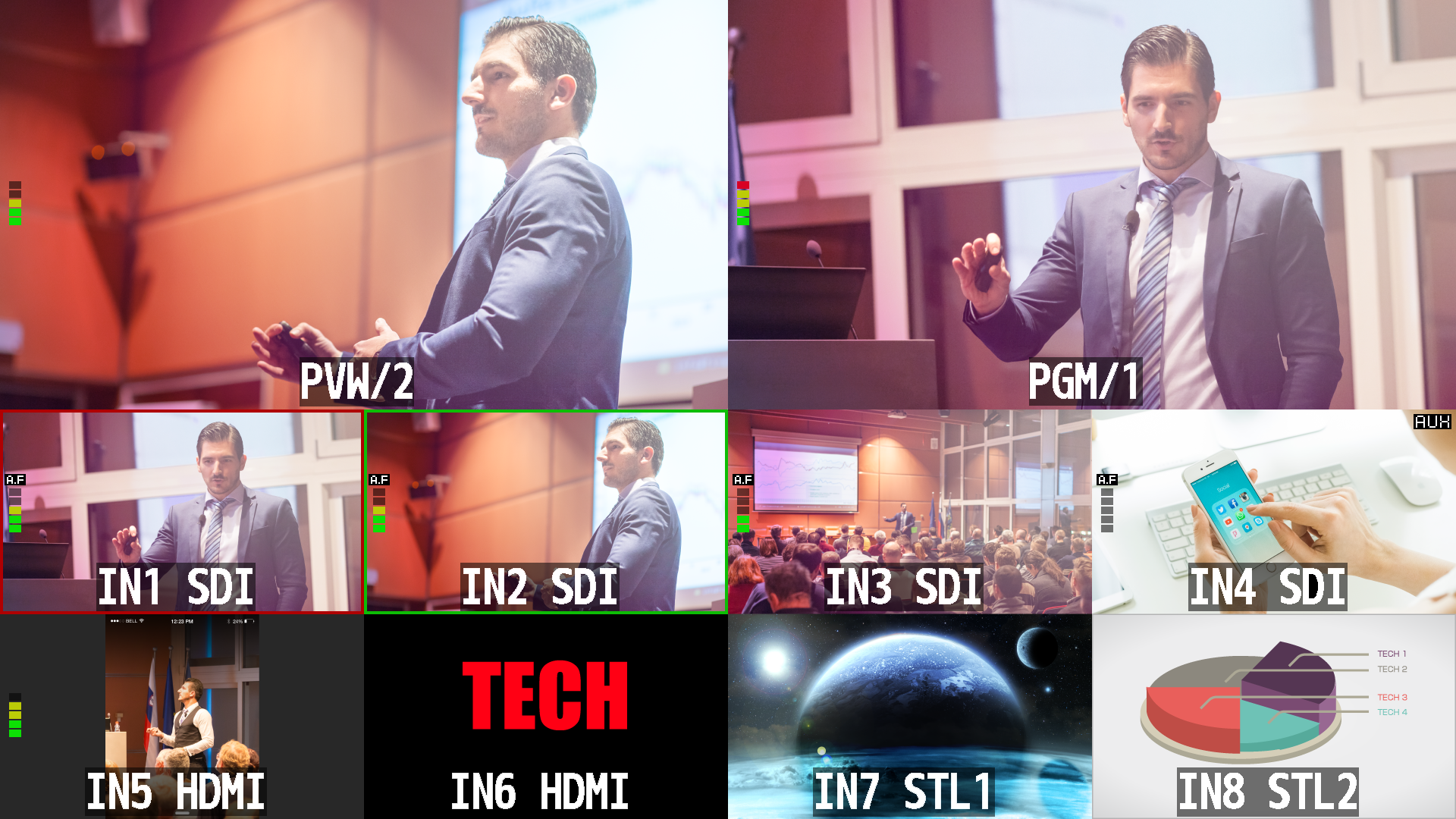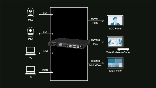A mátrix üzemmód megkönnyíti a különböző tartalmak küldését két vagy három képernyő célpontra egyetlen kapcsolóról, miközben a programhangot keveri és a PTZ távoli kamerákat vezérli.