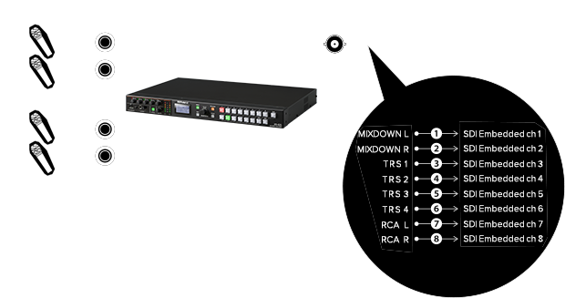 Az SDI 1 és 2 kimeneteken akár nyolc analóg hangbemenet külön csatornákon történő beágyazása. Válasszon a különböző betáplálási módok közül - pre-effekt (száraz), poszt-effekt és pre-fader (nedves), vagy poszt-effekt és poszt-fader (nedves) -, hogy megfeleljen az élő esemény utáni utómunka igényeinek. Ez a funkció többnyelvű eseményeknél is hasznos, mivel lehetővé teszi, hogy a hangalámondást vagy a nyelvi fordítást a saját hangcsatornáján rögzítse.