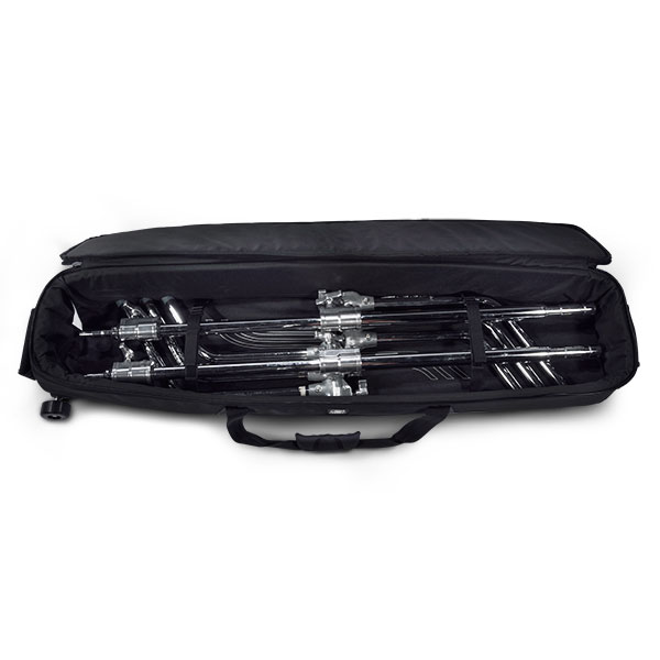 C-állvány lámpatáska beépített nagy teherbírású kerekekkel és kocsival a könnyű szállítás érdekében. Beépített nagy teherbírású kerekek és kocsi a könnyű szállítás érdekében. U-grip ergonómikus, reteszeléssel ellátott hordozófogantyú. A nejlon kötőpántok a helyén tartják a lámpaállványokat.