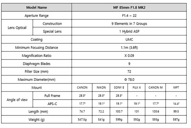 A Samyang MF 85mm F1.4 MK2 egy népszerű manuális portréobjektív következő generációja, amely a mélységélességen túl kiváló szín- és képmegjelenítéssel rendelkezik. Kapható Canon EF, Nikon F, Sony E, Fujifilm X, Canon M és MFT változatban. Az új MK2 változat optikája megegyezik az eredeti modellével, de mostantól időjárásálló, új fókuszgyűrűvel rendelkezik a jobb fogás érdekében, valamint egy kapcsolóval, amely lehetővé teszi a rekeszérték végtelen beállítását.