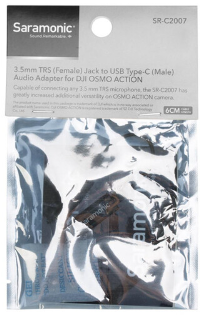 A Saramonic SR-C2007 egy kompakt, 2,4 hüvelykes (6 cm) audioadapter kábel, amely DJI Osmo Action kamerákhoz lett optimalizálva, egyik végén aranyozott 3,5 mm-es TRS aljzattal, a másik végén USB Type-C csatlakozóval, amely lehetővé teszi a külső mikrofonok, vezeték nélküli vevők, felvevők vagy keverők közvetlen hangrögzítését. Plug-in tápellátást biztosít a nem akkumulátorral működő mikrofonokhoz, korrózióálló, aranyozott érintkezőivel kristálytiszta jelminőséget biztosít, és mindössze 6 g súlyával tartós, alacsony profilú megoldást kínál az akcióorientált alkotóknak a videó hangminőségének javításához extrém körülmények között.