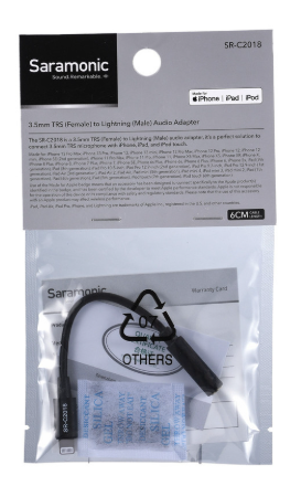 A Saramonic SR-C2018 egy Apple MFi tanúsítvánnyal rendelkező Lightning-3,5 mm-es TRS audio bemeneti adapterkábel, amelyet iPhone-okhoz és iPad-ekhez terveztek, és amely lehetővé teszi külső mikrofonok, vezeték nélküli vevők, keverők vagy felvevők zökkenőmentes csatlakoztatását professzionális minőségű felvételek és streaming céljából – kompatibilis mikrofonokhoz plug-in tápellátással. A mindössze 14 cm hosszú és 5 g súlyú, könnyű, aranyozott csatlakozó megoldás korróziómentes, kiváló minőségű jelátvitelt biztosít, ideális kamerás videofelvételekhez, élő közvetítésekhez vagy terepi hangfelvételekhez (megjegyzés: csak audio bemenet; nincs kimenet külső eszközökhöz, és az alkalmazásnak támogatnia kell a külső Lightning audiót).