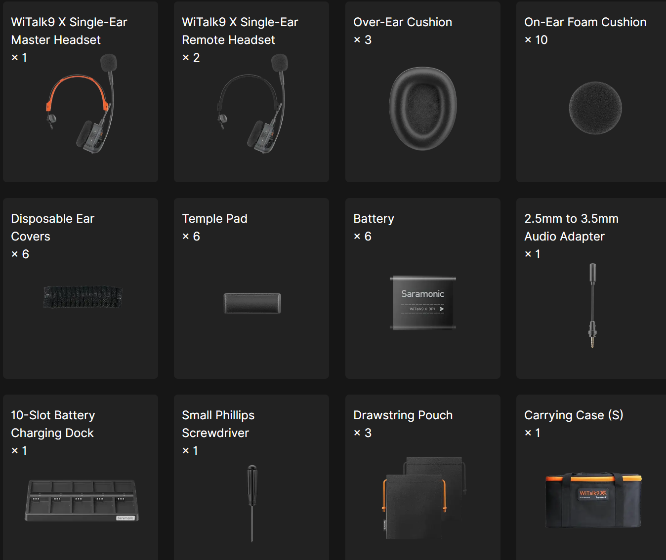 A Saramonic WiTalk9 X 3 személyes, egyfülű, vezeték nélküli, teljes duplex interkomrendszer (katalógusszám: WiTalk9 X-3S) egy kompakt, hub nélküli, DECT-alapú kommunikációs megoldás, amely az 1,9 GHz-es frekvenciasávon működik, és olyan professzionális csapatok számára készült, amelyeknek megbízható, kézmentes hangkommunikációra van szükségük igényes környezetben, például élő események, filmgyártás és terepi műveletek során. [1][9][10]