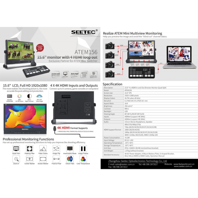 Többnézetes monitor átmenő HDMI I/O-val, amely alkalmas HDMI-felülnézeti eszközökhöz, például az ATEM Minihez. Quad View funkció mind a négy bemenet megjelenítéséhez!