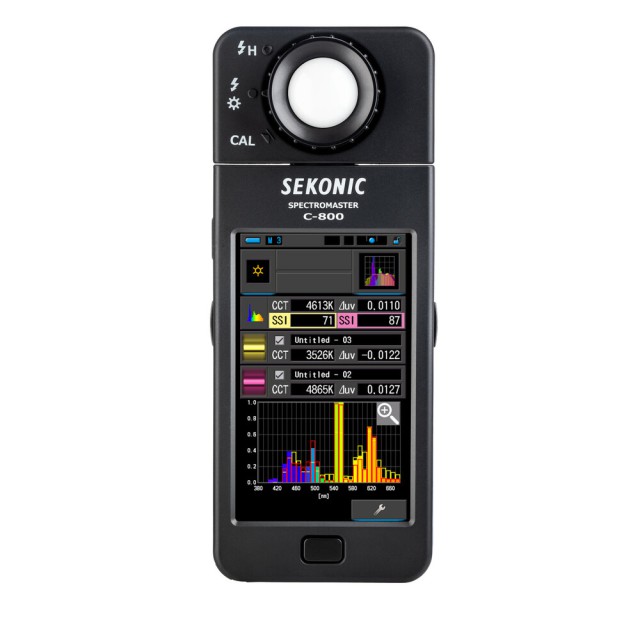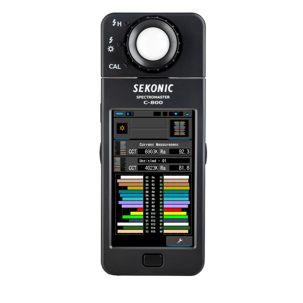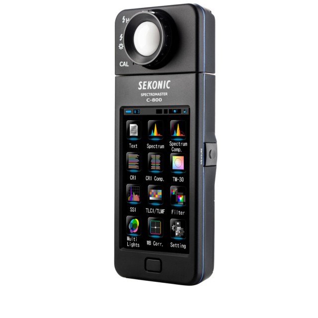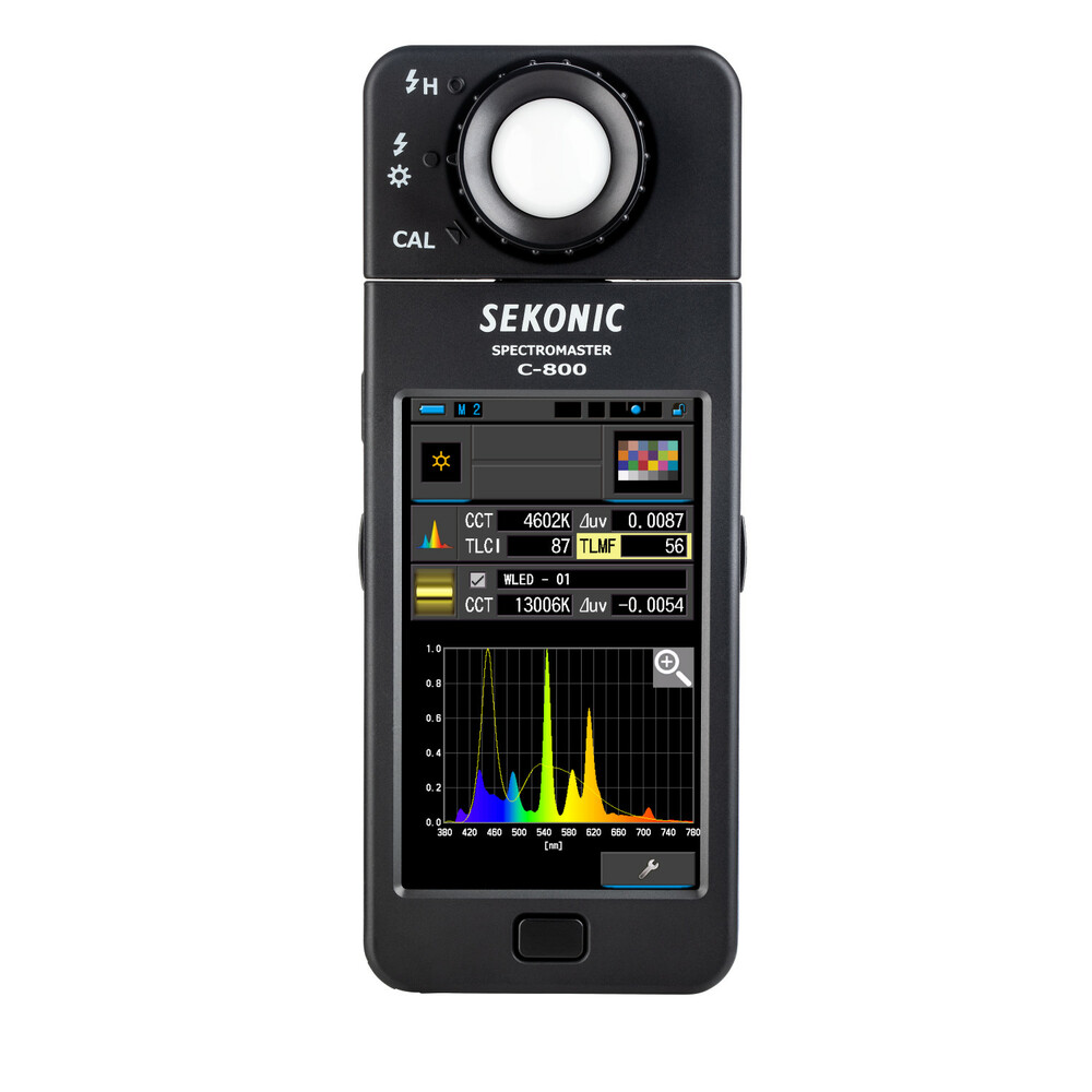A SekonicC-800 SpectroMaster színmérő fotósoknak, videósoknak, operatőröknek és világosítóknak készült. A SekonicC-800 SpectroMaster színmérő egy olyan fejlett terepi mérőeszköz, amely gyakorlatilag minden fényforrást képes leolvasni, legyen az LED, vaku, izzó, HMI, fénycső vagy a természetes fény spektrumában. A legfontosabb, hogy ez egy praktikus világítási eszköz, amely a 4,3"-os színes érintőképernyőn 11 különböző megjelenítési mód segítségével elemzi a fényforrást, és konkrétan jelzi, hogy mit kell tennie a kívánt hatás eléréséhez. A mérő CMOS-érzékelője akár 1 nm-es lépésekben is lehetővé teszi a mérést, és a fénykibocsátás színtüskéinek rögzítését - ez különösen értékes funkció, ha LED, HMI, fénycsöves világítással és vegyes fényforrásokkal dolgozik.