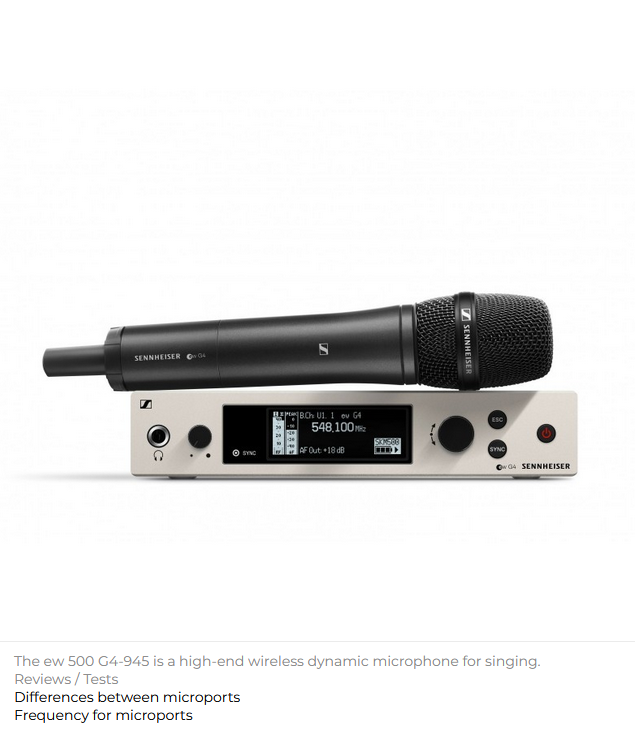 A Sennheiser ew 500 G4-945 egy prémium UHF vezeték nélküli dinamikus kézi mikrofonrendszer énekléshez és beszédhez, amely tartalmazza az SKM 500 G4 adót cserélhető MMD 945-1 szuperkardioid kapszulával, 2880 hangolható frekvenciával 72 MHz sávszélességen, HDX zajszűréssel, OLED kijelzővel, töltőkapcsokkal és rackbe szerelhető vevővel a kristálytiszta élő előadás érdekében.