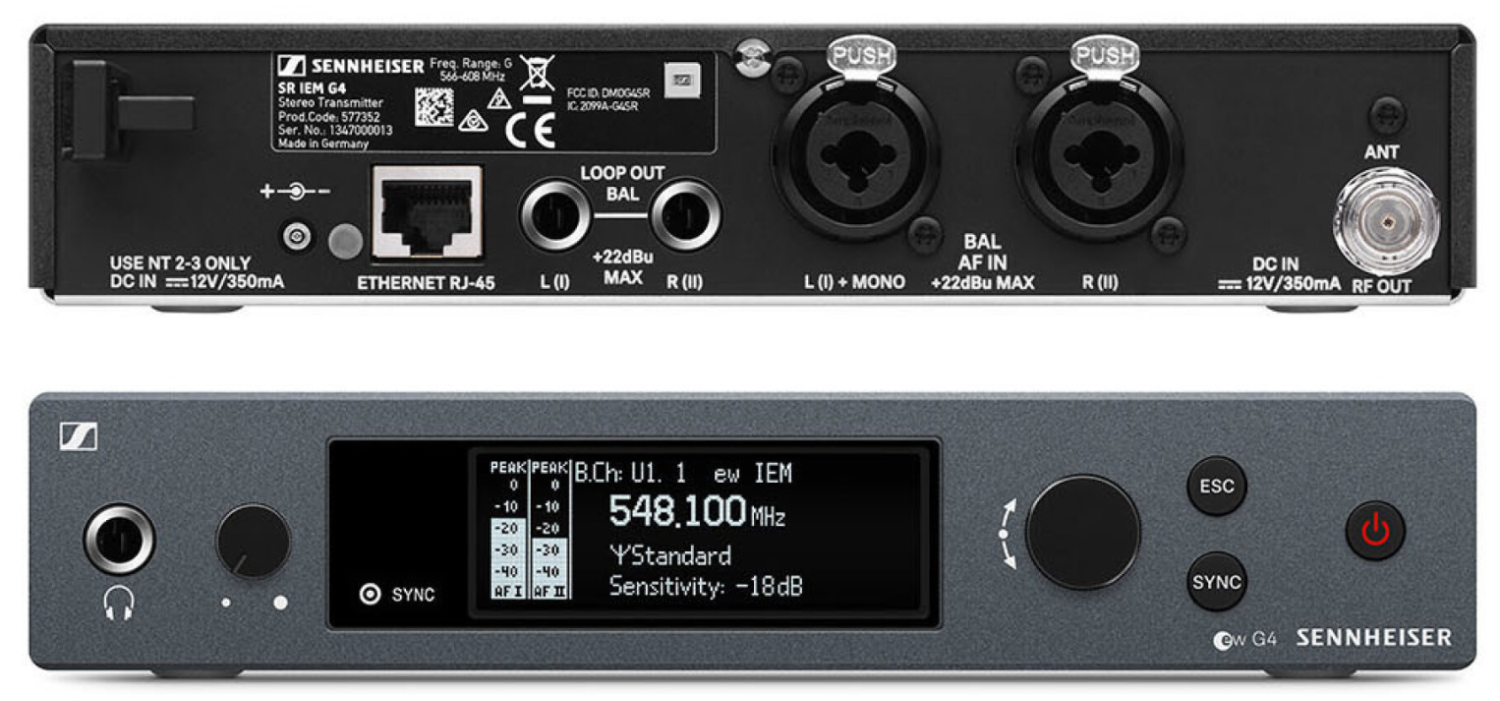 A készlet tartalmaz egy fél rack méretű sztereó SR IEM G4 adót, amely strapabíró, teljes fém kivitelű, intuitív kezelést biztosító OLED kijelzővel rendelkezik. Az adó és a vevők közötti vezeték nélküli szinkronizálás infravörös kapcsolaton keresztül könnyen megvalósítható, míg a Sennheiser WSM vezérlőszoftverrel való kompatibilitás rugalmas frekvenciaelosztást tesz lehetővé. Akár 16 kompatibilis csatornával, 42 MHz sávszélességgel és 1680 választható frekvenciával az EW IEM G4-A1 zavarmentes működést biztosít forgalmas RF-környezetekben.