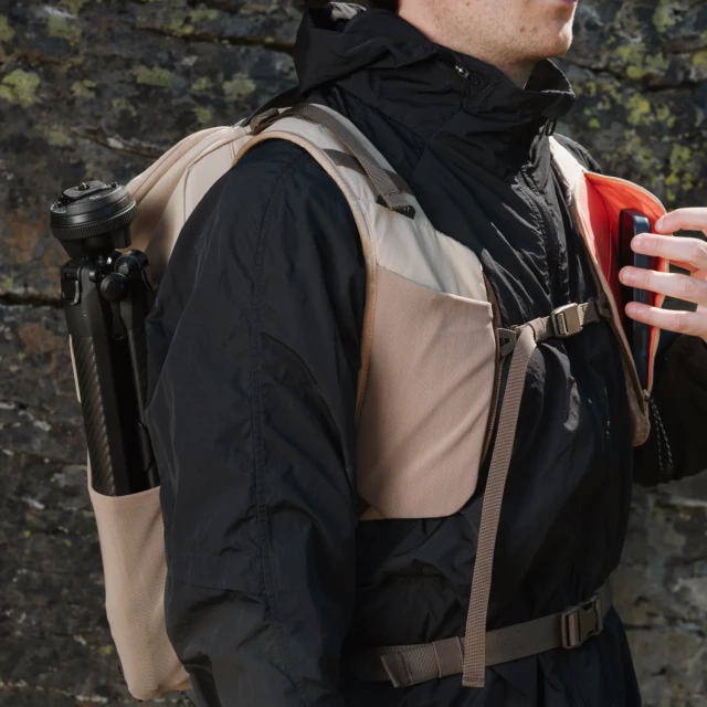 A mellény ihlette vállpántok rugalmas cipzáras zsebekkel és integrált MagSafe töltőcsatornával rendelkeznek, így gyorsan hozzáférhet a fényképezőgépéhez, filmjéhez, telefonjához, szűrőihez és apró snackjeihez közvetlenül a testén.