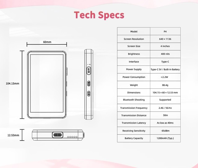 A Shimbol P4 Pink egy kompakt, 4 hüvelykes vezeték nélküli okos vezérlőképernyő, amely lehetővé teszi okostelefonjának szinte nulla késleltetéssel történő távoli vezérlését. 640 × 1136 felbontású multi-touch kijelzővel, Bluetooth 5.0 kapcsolattal és széles körű Android/iOS kompatibilitással rendelkezik, így ideális vloggerek, alkotók és távoli felvételek készítéséhez.