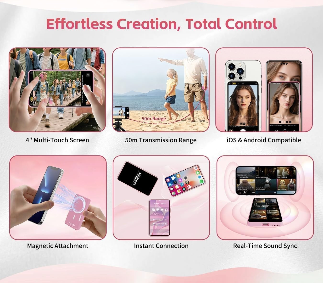 A Shimbol P4 Pink mindössze 0,04 másodperces rendkívül alacsony késleltetésével és stabil 50 méteres vezeték nélküli hatótávolságával valós idejű reagálóképességet biztosít, így tökéletesen alkalmas távoli felvételekhez, csoportképekhez, élő tartalomkészítéshez és prezentációkhoz. A készülék a legtöbb Android és iOS okostelefont támogatja, és nem igényel bonyolult beállítást – egyszerűen csak csatlakoztassa, és azonnal elkezdheti irányítani telefonját.