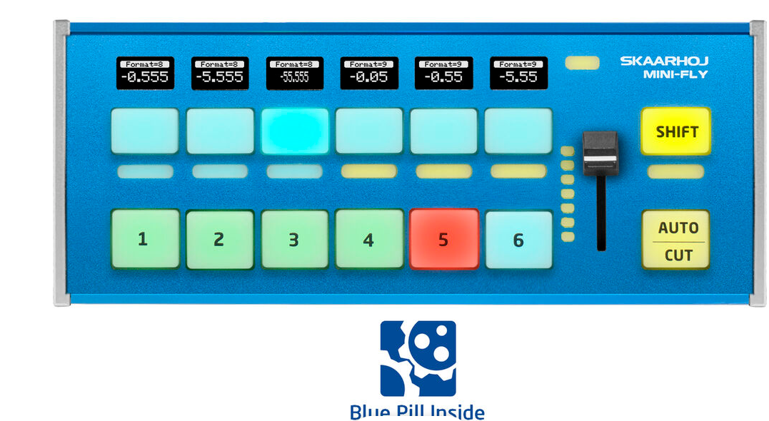 A Blue Pill technológiával ellátott SKAARHOJ Mini Fly Controller egy kompakt élő produkciós keverőpult, amelyet kis méretű, többkamerás felállásokhoz terveztek. Programozható, OLED-kijelzővel ellátott négyirányú gombjaival, RGB-visszajelzésével és beépített Blue Pill technológiájával rugalmas vezérlést, hangfigyelést és átmenetkezelést biztosít rendkívül hordozható formában.