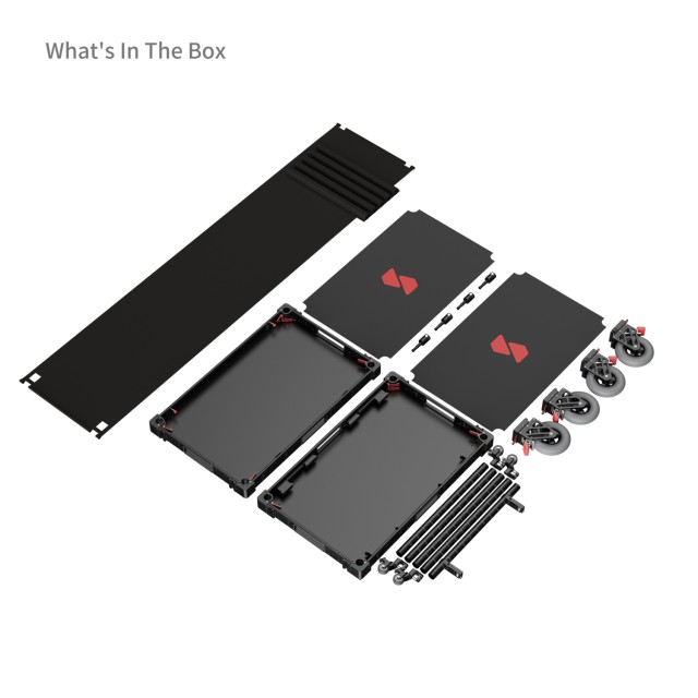 A kétszintes platformszerkezetnek köszönhetően a felső fedélzet több rögzítési pontot biztosít a monitorok, laptopok, vezeték nélküli adók és áramellátó rendszerek csatlakoztatásához, míg az alsó fedélzet biztonságosan befogadja az ömlesztett berendezéseket. A kocsi kivételes stabilitást biztosít, biztonságosan hordozza eszközeit mozgás közben.