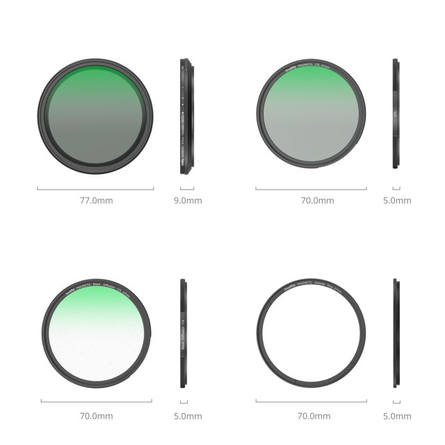 1. A készlet tartalmazza a videofelvételeknél gyakran használt alapvető VND, CPL és Black Mist szűrőket, valamint a menetes adaptergyűrűket és a mágneses objektívfedelet, a tárolótáska pedig ingyenes ajándékként jár hozzá.