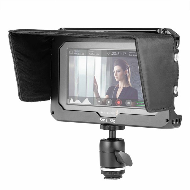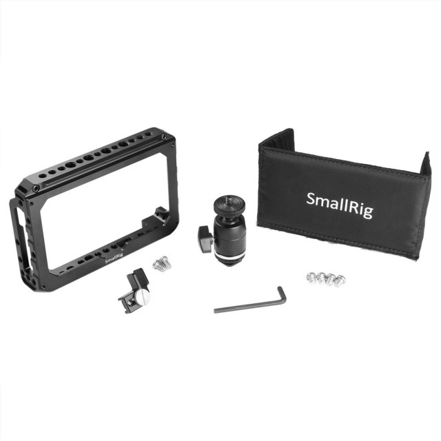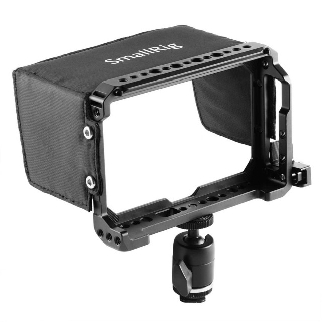 SMALLRIG Monitor Cage Accessory Kit 1981 egy 5'' monitor cage napellenzővel. Ez egy nagyszerű módja a Blackmagic Video Assist monitor védelmének. A CNC megmunkált alumíniumból készült, meglehetősen könnyű és masszív, és továbbra is hozzáférhet a monitor minden funkciójához. Számos 1/4"-20 és 3/8"-16-os menetes furatot tartalmaz a számos rögzítési lehetőséghez. A tetején integrált NATO-sín a NATO-szabvány szerinti tartozékok közvetlen rögzítéséhez. A mellékelt HDMI bilincs a fényképezőgép HDMI portjának védelmére. Emellett egy napellenzőt tartalmaz, tökéletes a közvetlen napfény megakadályozására. Ezen kívül kínálunk hozzá egy SmallRig 1875-ös gömbfejű monitortartót.