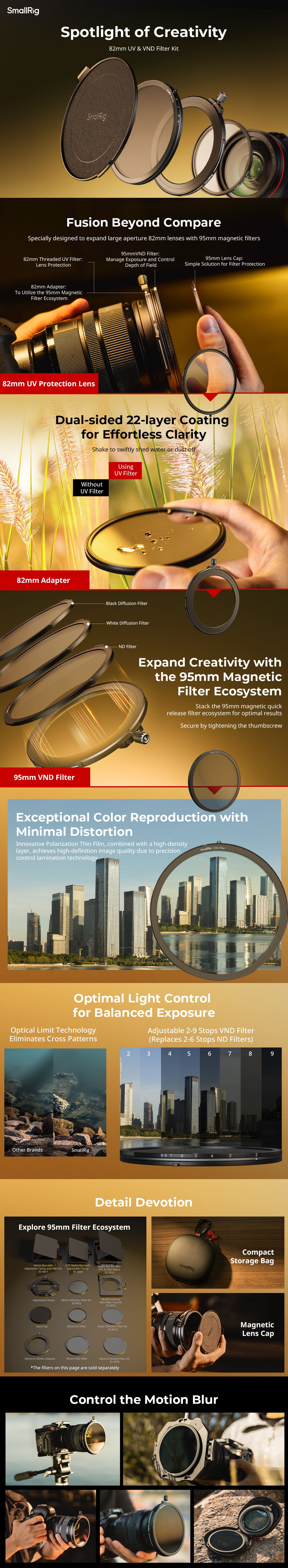 A SmallRig 82 mm-es UV és VND szűrőkészlet 4781 a 82 mm-es széles rekesznyílású objektívvel történő fotózáshoz és videózáshoz készült. Ez a készlet tartalmazza a 82 mm-es UV-szűrőt, az adaptert, a nagy felbontású 8K VND-szűrőt és a porvédőt. Az UV-szűrő kétoldalas, 22 rétegű bevonattechnológiát használ, amely fokozza a vízálló és tükröződésmentes tulajdonságokat, megkönnyítve a gyors tisztítást a portól és a víztől, miközben hatékonyan megakadályozza a tükröződést.