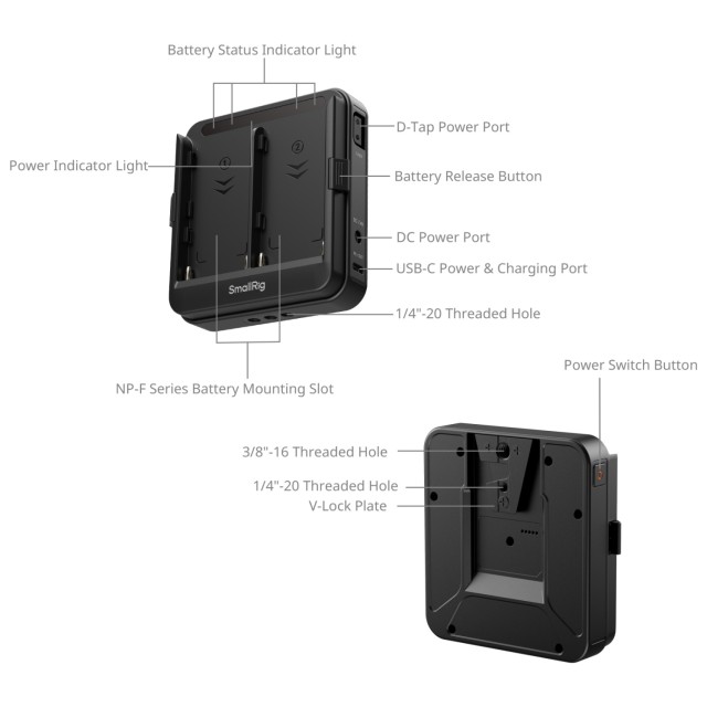 A SmallRig adapterlemez NP-F típusú akkumulátorokhoz (UPS támogatással) 5536 úgy lett kialakítva, hogy folyamatos áramellátást biztosítson tükör nélküli fényképezőgépek, monitorok és egyéb, NP-F sorozatú akkumulátorokat használó berendezések számára. Ez a lemez V-mount lemezzel vagy az alsó 1/4"-20 menetes furatokkal szerelhető fel, és egy vagy két NP-F akkumulátort tud befogadni a berendezés áramellátásához. Két akkumulátor felszerelése esetén a hot-swap funkció lehetővé teszi az egyik akkumulátor cseréjét a csatlakoztatott eszközök leállítása nélkül, biztosítva ezzel a szünetmentes áramellátást (UPS).
