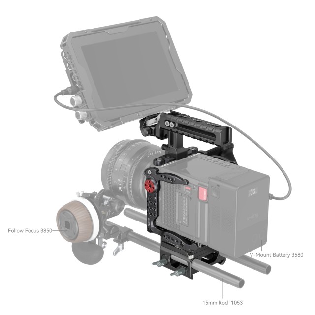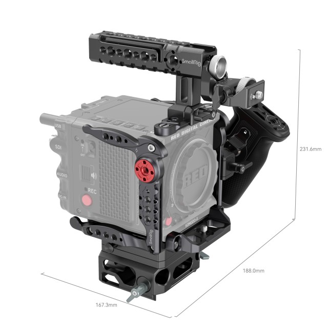 Az oldalsó markolat a bal és a jobb kéz számára is elérhető, ergonomikus és szénszálas anyagból készült, könnyű és kényelmes fogást biztosít; támogatja az egy gombot a forgatás beállításához, könnyű fenntartani a kényelmes fogást és a kamera működését. A moduláris kialakítású cage, a felső lemez és az alaplemez egymástól függetlenül használható. A felső lemez szétszerelése után kompatibilis lehet a KOMODO OUTRIGGER HANDLE és a DSMC3 RED TOUCH 7.0". A készlet beépített 1/4"-20 menetes furatokkal, ARRI 3/8"-16-os menetes furatokkal, 3/8"-16-os menetes furatokkal, NATO-sínekkel, vakusínes rögzítőkkel és egyéb interfészekkel rendelkezik, kényelmesen felszerelhető 15 mm-es rúdrögzítő 3598, mikrofon, magic arm 3873 és egyéb kiegészítők. A cage elülső része kibővíthető objektívtartó adapter tartóra, a Metabones tartó adapter rögzítésével, a fényképezőgép objektívtartójának védelme, a felvétel stabilitásának növelése érdekében. A 15 mm-es rudak alsó felszerelése után kibővíthető a 3850-es Follow Focusszal, a 3645-ös Matte Boxszal, a BSL2680 objektívtámasszal stb. Beépített integrált csavarhúzót és imbuszkulcsot is tartalmaz a könnyű szét- és összeszereléshez.