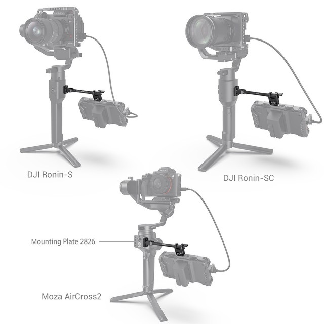 A SmallRig állítható monitortartó egyes DJI & Zhiyun & Moza 2889 kézi gimbal stabilizátorokhoz a monitor és a tartozékok stabilizátorokhoz való rögzítésére szolgál. A monitortartó a ZHIYUN CRANE 3/3S, WEEBILL-S/LAB modellekhez egy 1/4"-20-as csavarral és beépített rozettával rögzíthető a csavarodás megakadályozása érdekében, és a DJI Ronin-S/SC/RS 2/RSC 2 oldalára egy rozettás adapterlemezzel rögzíthető. Három 1/4"-20-as menettel rendelkezik további tartozékok, például a Cold Shoe 2260 mikrofon vagy audio vevő számára. A monitortartó 360°-os dőlésszöggel rendelkezik, és legfeljebb 2,2 kg súlyú monitort tart.