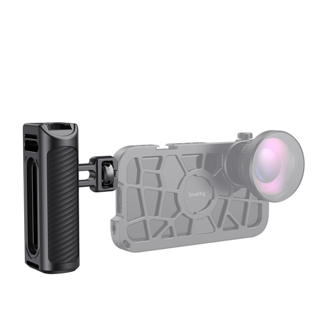 A SmallRig HSS2424 alumínium oldalsó markolat okostelefon cage-ekhez ajánlott kényelmének javítására szolgál, hogy tartósabb és stabilabb legyen a telefon fogása. Kompatibilis az olyan SmallRig Pro mobiltelefon cage-ekkel, mint a 2775, 2776, stb. és az univerzális SmallRig cage-ekkel, mint a CPU2391B, 2791, stb. A beépített csavarkulcs a fogantyú magasságának beállítására és a reteszelőcsavar meghúzására is használható. Három szabványos 1/4-20-as menetes lyukkal és egy vakusín tartóval rendelkezik a tetején olyan tartozékok, mint például mikrofon vagy LED-lámpa felszereléséhez. A fogantyú kompatibilis a SmallRig PAC2456 kézi pánttal a biztonságosabb és stabilabb kézi felvételek készítéséhez. Mindössze 224 g súlyú, alumínium teste csúszásmentes szilikonbevonattal rendelkezik, amely kényelmes fogást biztosít a hosszan tartó használat során.