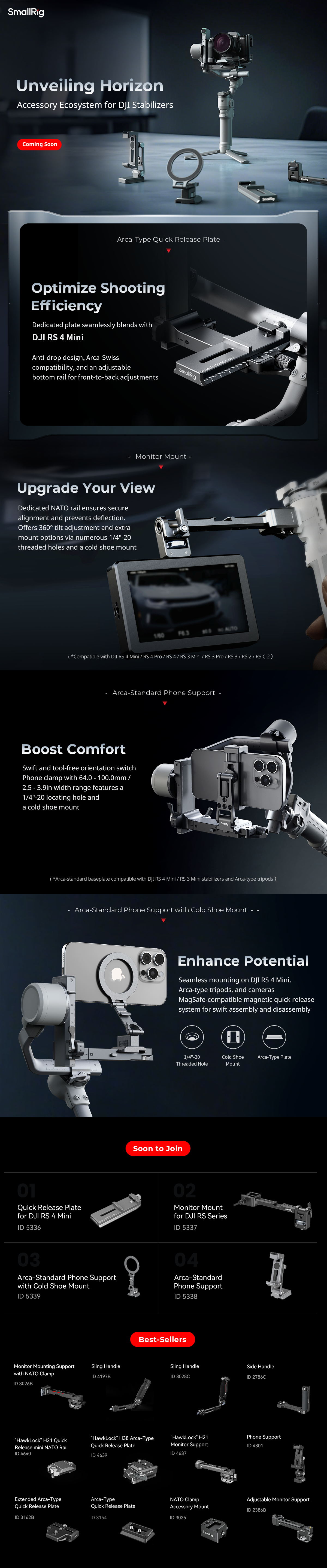 A kompatibilitásra összpontosítva, 1/4"-20-as menetes furatokat, hidegcipőfoglalatokat, Arca-típusú interfészeket és NATO-síneket tartalmaz, lehetővé téve az olyan tartozékok, mint a videólámpák, mikrofonok és varázskarok könnyed rögzítését. A MagSafe gyorskioldó rendszer lehetővé teszi a gyors összeszerelést és szétszerelést, míg a felső tengely szerszámmentes 270°-os dőlésszögbeállítást, az alsó tengely pedig 360°-os panorámaforgatást és 240°-os dőlésszögbeállítást biztosít. Elegáns, összecsukható kialakítása könnyű szállítást és tárolást biztosít.