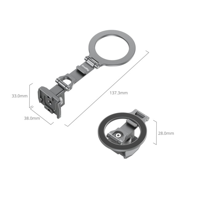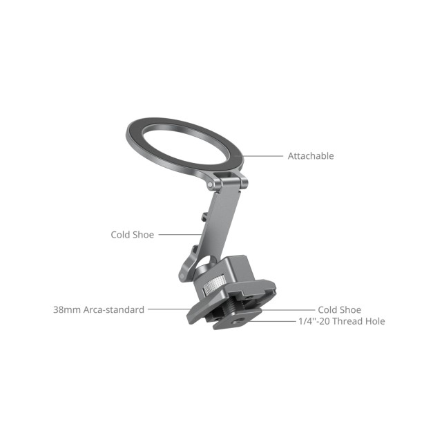 A kompatibilitásra összpontosítva, 1/4"-20-as menetes furatokat, hidegcipőfoglalatokat, Arca-típusú interfészeket és NATO-síneket tartalmaz, lehetővé téve az olyan tartozékok, mint a videólámpák, mikrofonok és varázskarok könnyed rögzítését. A MagSafe gyorskioldó rendszer lehetővé teszi a gyors összeszerelést és szétszerelést, míg a felső tengely szerszámmentes 270°-os dőlésszögbeállítást, az alsó tengely pedig 360°-os panorámaforgatást és 240°-os dőlésszögbeállítást biztosít. Elegáns, összecsukható kialakítása könnyű szállítást és tárolást biztosít.