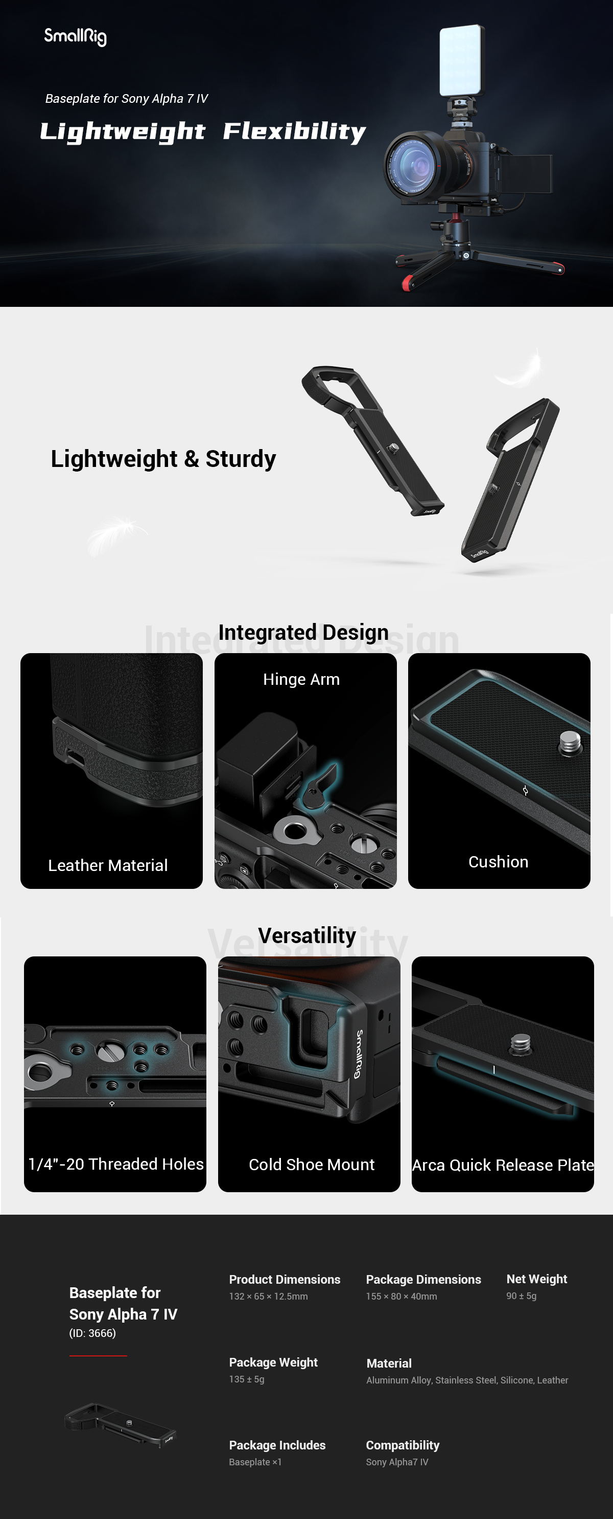 A SmallRig alaplap a Sony Alpha 7 V / 7R V / Alpha 7 IV 3666 modellekhez készült, célja, hogy javítsa a fogás élményét, lehetővé tegye a állványról és kézből történő fényképezést, miközben védi a kamera alsó részét. A kamera alsó részéhez 1/4" -20-as csavarral és pozicionáló csapszeggel rögzíthető, és beépített szilikon alátéttel rendelkezik, amely megakadályozza a karcolódást és a torzulást. A akkumulátor fedélén található egy orsócsavar, amely alkalmazkodik a kamera görbületéhez, és helyet hagy a kisujjnak a kényelmes fogáshoz; a kiválasztott valódi bőrbe ágyazva a talplemezbe integrálódik a kamera testébe. A 1/4"-20-as menetes furatok és a hideg cipőtalp az alsó részen mini állványokat és mikrofonokat támogatnak. Ezenkívül az Arca rendszerrel kompatibilis alaplap lehetővé teszi a gyors váltást állvány, stabilizátor (DJI RS 2 / RSC 2 / RS 3 / RS 3 Pro) és kézi felvétel között. A beépített mágneses kulcs megkönnyíti a leszerelést és a felszerelést.