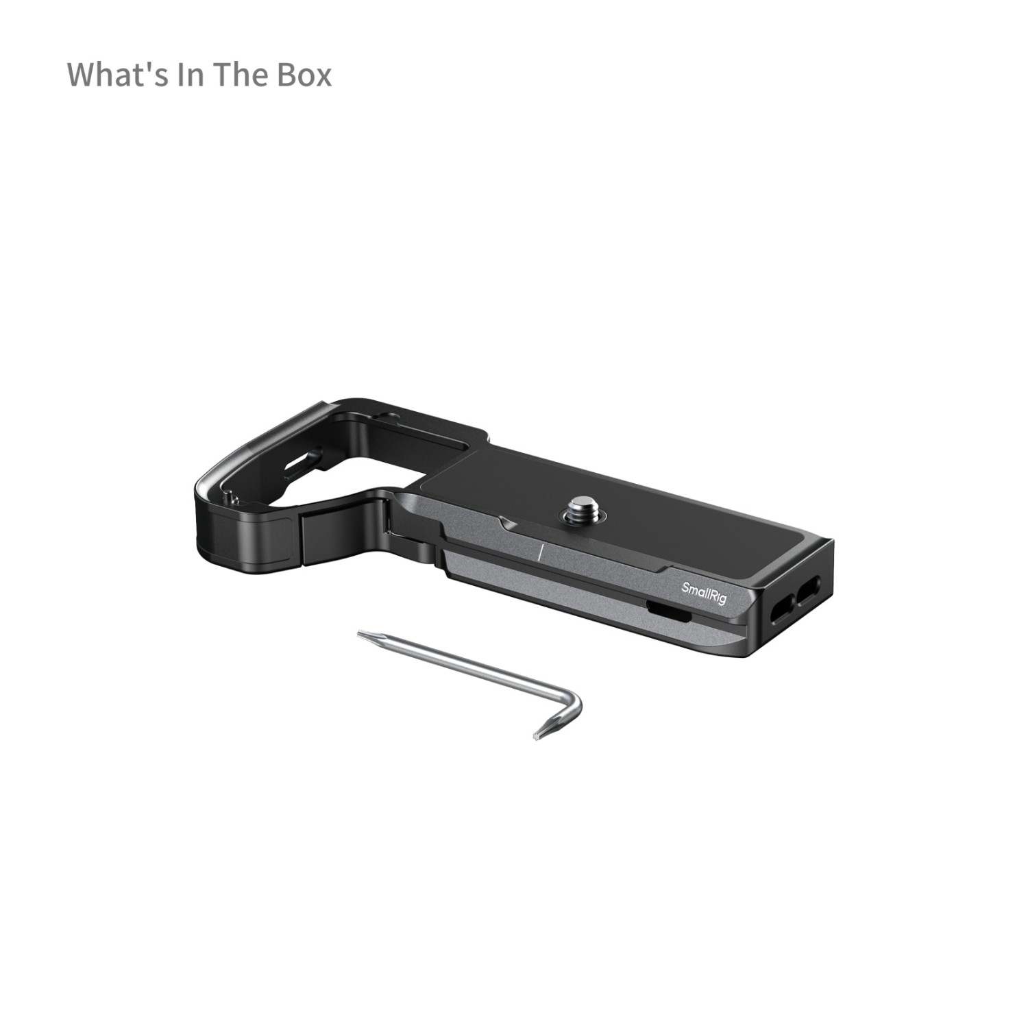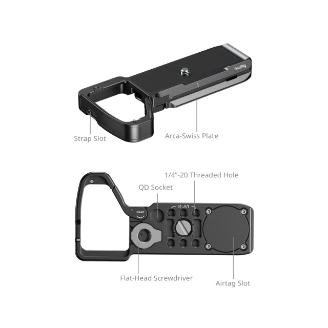 A fényképezőgéphez 1/4"-20-as csavarral rögzíthető, és védőalátétekkel van ellátva, amelyek megakadályozzák a karcolódást és a deformálódást. Ez a rögzítőlemez AirTag-nyílással rendelkezik, amely lehetővé teszi az AirTag nyomkövető eszköz rögzítését és a fényképezőgép zökkenőmentes követését. Ezenkívül csuklós karral van ellátva az akkumulátorok helyén, ami javítja az ergonómiát és támaszt nyújt a kisujjnak.