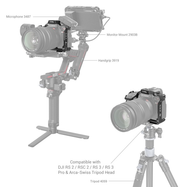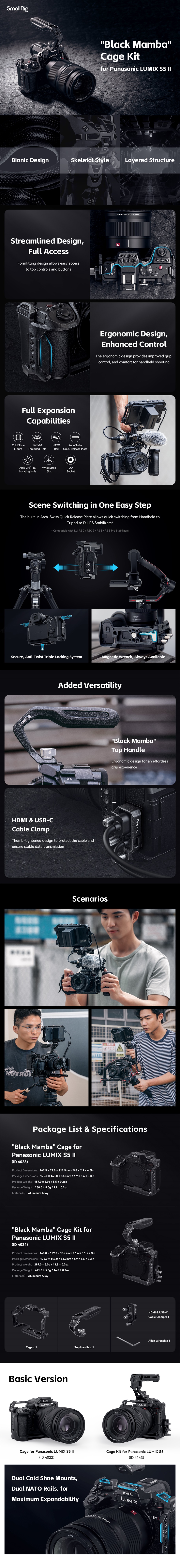 A SmallRig "Black Mamba" cage a Panasonic LUMIX S5 II / S5 IIX 4023 kamerához a kamera védelmére és a tartozékok rögzítésére szolgál. A fényképezőgépet egy alsó 1/4"-20-as csavarral és két oldalsó rögzítő adapterrel rögzíti, a karcolásokat megakadályozó gumipárnákkal, és egészében "Black Mamba" stílusú, amely teljes hozzáférést biztosít az összes felső kezelőszervhez. A tartozékok rögzítési pontjai közül az 1/4"-20-as furatok a 2093B oldalsó fogantyút támogatják; az elülső 1/4"-20-as rögzítőfurat a 3276-os rúdrögzítőhöz illik a követő fókuszrendszerhez; az ARRI 3/8"-16-os rögzítőfurat pedig a 3786-os felső fogantyúhoz vagy a 2903B monitorrögzítőhöz. Tartalmaz továbbá egy bal oldali NATO-sínt a 3847-es oldalsó fogantyúhoz; hideg cipőfoglalatokat mikrofon és LED-videólámpa rögzítéséhez; és egy alsó QD aljzatot a QD-vállpánt felszereléséhez. Az alján található egy Arca-Swiss gyorskioldó lemez, amely DJI RS 2 / RSC 2 / RS 3 / RS 3 Pro kardánokhoz és Arca-Swiss állványokhoz alkalmas, valamint egy menetes furat a DJI RS 2 / RSC 2 és Arca-Type Quick Release Plate 3154 gyorskioldó lemez (riser pad) számára. Az elem mindkét oldalán és alján hevederfuratokkal is rendelkezik, amelyek kompatibilisek a 3848-as kézi hevederrel, a PSC2428-as vállpánttal stb. Emellett egy mágneskulcsot is tartalmaz a könnyű szétszereléshez és összeszereléshez.