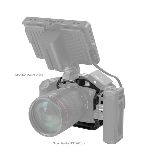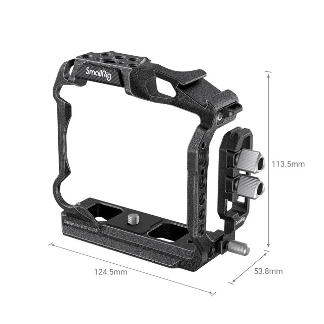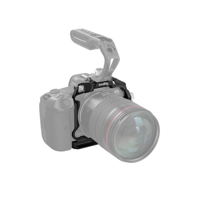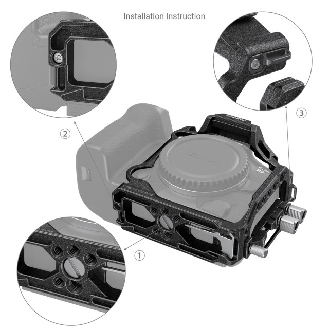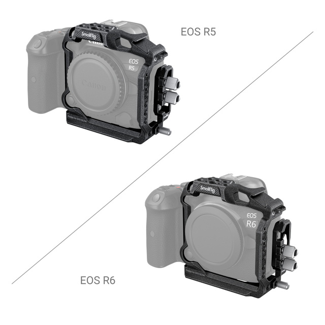 A SmallRig "Black Mamba" Half Cage & Cable Clamp for Canon EOS R5&R6 3656 úgy lett kialakítva, hogy a kamera markolata teljesen hozzáférhető maradjon, és több tartozékrögzítési pontot biztosítson. A cage egy 1/4"-os csavarral és egy rögzítőcsappal van rögzítve az alján és a bal oldali vállpánt furatán keresztül. Atöbb ponton elhelyezett szilikonbetétek védik a kamerahuázat a karcolásoktól. A "Black Mamba" stílus folytatódik, fenntartva a teljes hozzáférést a kamera kezelőszerveihez. A cage több 1/4"-20, ARRI 3/8"-16-os rögzítőfurattal, vakusaruval rendelkezik olyan tartozékok, mint a 2093-as oldalsó markolat, 1984-es felső markolat, 2070-es Magic Arm, mikrofonok, lámpák vagy a PAC2456 kézi heveder rögzítéséhez. Az integrált Arca-Type alap közvetlenül kompatibilis a DJI RS 2 & RSC 2 Gimbalhoz, hogy gyors váltást tegyen lehetővé az RS 2-vel az állványos és a kézi felvételek között, és az integrált csavarkulcs az alján segít a csavarok eltávolításában. A csomag részét képező HDMI & USB-C kábelbilincs a véletlen szétkapcsolódás megakadályozására és a stabil jel biztosítására szolgál.