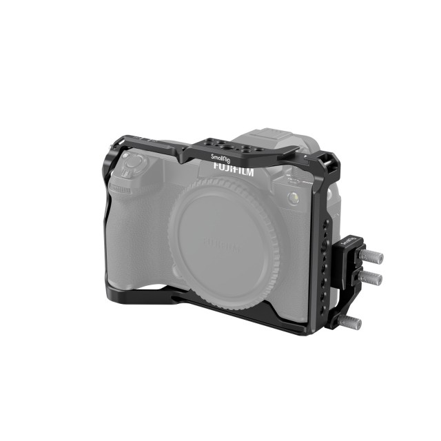 A SmallRig Cage & Cable Clamp for FUJIFILM GFX100S/GFX50S II 3715 a kamera védelmére, különböző tartozékok rögzítésére és stabil jelátvitel biztosítására szolgál. A fényképezőgép rögzítése egy 1/4"-20-as csavarral az alján és a jobb oldali vállpánt lyukán keresztül, hogy megakadályozza az elmozdulást. Fenntartja a hozzáférést a gombokhoz, kártyafoglalatokhoz, portokhoz, az akkumulátorfedélhez és a dönthető képernyőhöz. Rendelkezik 1/4"-20 furatokkal, ARRI 3/8"-16-os pozícionáló furatokkal, NATO sínnel a 2165-ös felső fogantyú, a 2093-as oldalsó fogantyú, a HSS2426, 2187, valamint a 2903-as és 2904-es monitor tartó rögzítéséhez; a tetején vakusínnel rendelkezik mikrofon, LED lámpa, vaku kioldó stb. rögzítéséhez. Az Arca-Swiss gyorskioldó lemez a 3257-es állványhoz illeszkedik az állvány és a kézi felvételek közötti gyors váltáshoz; az alján lévő 1/4"-20-as menetes furat illik a DJI RS 2/RSC 2 stabilizátorok gyorskioldó lemezéhez (pad) a DJI RS 2/RSC 2 stabilizátorok stabilizátoros felvételekhez. A csavarok összeszereléséhez vagy szétszereléséhez egy hozzáférhető csavarkulcsot tartalmaz. Ezenkívül a tartozék egy HDMI és Type-C kábelrögzítő, amelyet egy csavarral rögzítünk, hogy megakadályozzuk a kihúzódást.