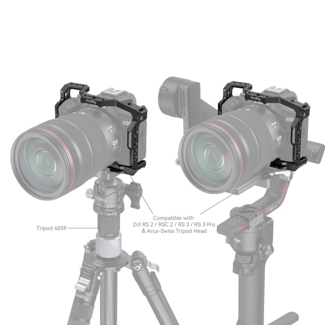 A SmallRig Cage for Canon EOS R50 4214 a fényképezőgép védelmére és a tartozékok rögzítésére szolgál. A fényképezőgépet egy alsó 1/4"-20-as csavarral és két oldalsó záróadapterrel rögzítő ketrec gumibetétekkel rendelkezik, amelyek megakadályozzák a karcolásokat, és teljes hozzáférést biztosít a gombokhoz, a kártyahelyekhez, a flip képernyőhöz és az akkumulátor ajtajához. A tartozéktartók közül az 1/4"-20-as menetes furatok, a 3/8"-16-os menetes furatok és az ARRI 3/8"-16-os rögzítőfuratok támogatják a Top Handle 3765, az Side Handle 2093C, a Monitor Mount 2903B és a Magic Arm 3875 tartozéktartókat;