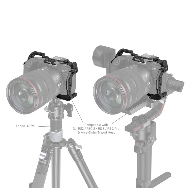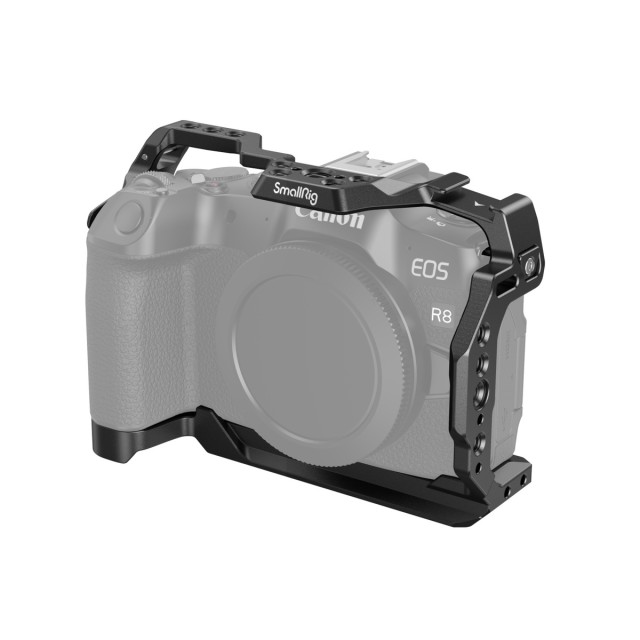 A SmallRig Cage for Canon EOS R8 4212 a fényképezőgép védelmére és a tartozékok rögzítésére szolgál. A fényképezőgépet egy alsó 1/4"-20-as csavarral és két oldalsó záróadapterrel rögzítő ketrec gumibetétekkel rendelkezik, amelyek megakadályozzák a karcolásokat, és teljes hozzáférést biztosítanak a gombokhoz, a kártyahelyekhez, a flip képernyőhöz és az akkumulátor ajtajához. A tartozéktartók közül az 1/4"-20-as menetes furatok, a 3/8"-16-os menetes furatok és az ARRI 3/8"-16-os rögzítőfuratok támogatják a 3765-ös felső fogantyút, a 2093C-es oldalsó fogantyút, a 2903B-es monitortartót és a 3875-ös Magic Armot; a felső hidegcipő tartó a 3468-as mikrofonhoz, a 3286B-es LED-videólámpához; a bal oldali NATO-sín pedig a 3260-as és 3813-as forgó oldalsó fogantyúhoz illeszkedik.