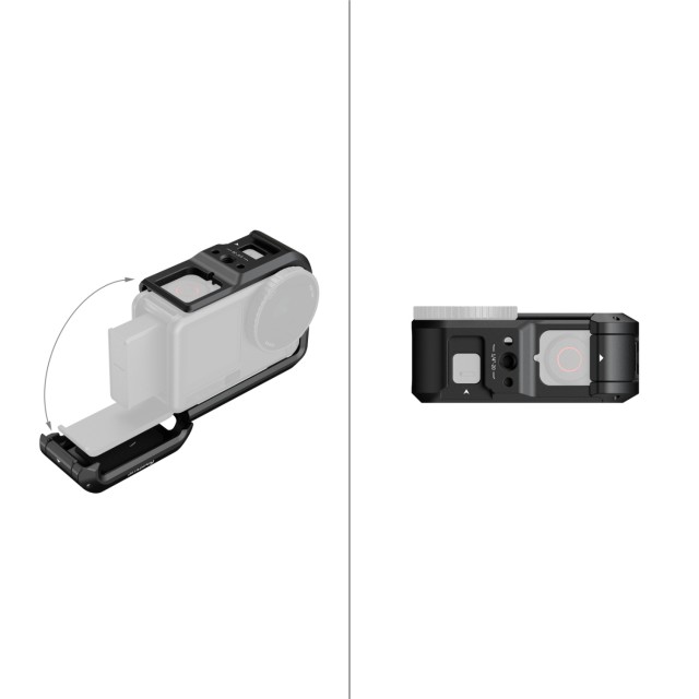 A keret hideg cipőfoglalattal rendelkezik, amelyhez lámpák vagy audio kiegészítők, például DJI Mic 2 vagy SmallRig Video Light (ID 5446) csatlakoztathatók. Ezenkívül oldalsó mágneses gyorskioldó rögzítésekkel rendelkezik, amelyek kompatibilisek a DJI eredeti kétirányú gyorskioldó adapter rögzítésével. A nyitott alapú kialakítás közvetlen hozzáférést biztosít a kamera mágneses gyorskioldó rögzítéséhez, ami a SmallRig kettős rögzítésű gyorskioldó tartóval (5890, 5779, 5991) párosítva gyors vízszintes és függőleges felvételi átmenetet tesz lehetővé.