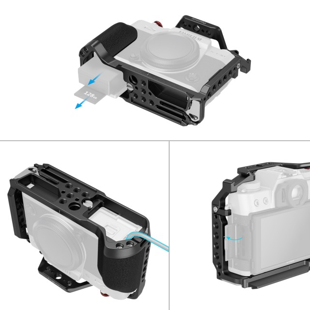 A SmallRig Cage for FUJIFILM X-T30 / X-T30 II / X-T30 III 5662 úgy lett kialakítva, hogy átfogó védelmet nyújtson a fényképezőgépnek, miközben sokoldalú bővítési interfészeket kínál. Az alsó 1/4"-20-as csavarral és a bal oldalon elhelyezett M3-as csavarral biztonságosan rögzíthető, beépített párnákkal, amelyek megakadályozzák a karcolásokat. Fontos, hogy a keret nem akadályozza a fényképezőgép kártyanyílásainak, képernyőjének, akkumulátorrekeszének vagy egyéb interfészeinek elérését.