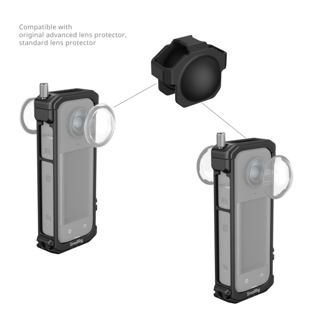 A SmallRig Cage az Insta360 X4 4278-hoz védelmet nyújt a kamerának és számos interfész-bővítő tartozékot biztosít a felvételek során a további kényelem érdekében. Az oldalsó réses kialakítású ketrec akadálytalan hozzáférést biztosít az akkumulátor ajtajához, ami lehetővé teszi a gyors akkumulátorcserét a ketrec szétszerelése nélkül. A ketrec szorosan illeszkedik az akciókamerához, belső szilikonbetétekkel, amelyek megakadályozzák a kameraváz megkarcolását. A kamera felülről kerül a ketrecbe, és egy hüvelykujjcsavarral rögzíthető, így a beszereléshez nincs szükség szerszámra. A ketrec rendelkezik egy hidegcipő rögzítővel és egy 1/4"-20-as csavarodásgátló menetes furattal az oldalán mikrofonok, LED-videólámpa és egyéb fényképészeti kiegészítők rögzítéséhez. Az alsó akciókamera-interfész összecsukható a tároláshoz, és rendelkezik egy 1/4"-20-as menetes furattal is, amelybe közvetlenül rögzíthetők 1/4"-20-as csavaros állványok, szelfibotok(4758) és egyéb eszközök. Szilikon objektívsapkát tartalmaz a tárolás során az objektív védelmére.