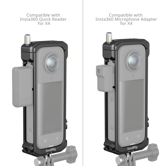 A SmallRig Cage for Insta360 X4 4278 kameravédelmet és számos interfész-bővítő tartozékot biztosít a felvételek során a további kényelem érdekében. Az oldalsó réses kialakítással rendelkező ketrec akadálytalan hozzáférést biztosít az akkumulátor ajtajához, lehetővé téve a gyors akkumulátorcserét a ketrec szétszerelése nélkül. A ketrec szorosan illeszkedik az akciókamerához, belső szilikonbetétekkel, amelyek megakadályozzák a kameratest megkarcolását. A kamera felülről kerül a ketrecbe, és egy hüvelykujjcsavarral rögzíthető, így a beszereléshez nincs szükség szerszámra. A ketrec rendelkezik egy hidegcipő rögzítővel és egy 1/4"-20-as csavarodásgátló menetes furattal az oldalán mikrofonok, LED-videólámpa és egyéb fényképészeti kiegészítők rögzítéséhez. Az alsó akciókamera-interfész összecsukható a tároláshoz, és rendelkezik egy 1/4"-20-as menetes furattal is, amelybe közvetlenül rögzíthetők 1/4"-20-as csavaros állványok, szelfibotok(4758) és egyéb eszközök. Szilikon objektívsapkát tartalmaz a tárolás során az objektív védelmére.