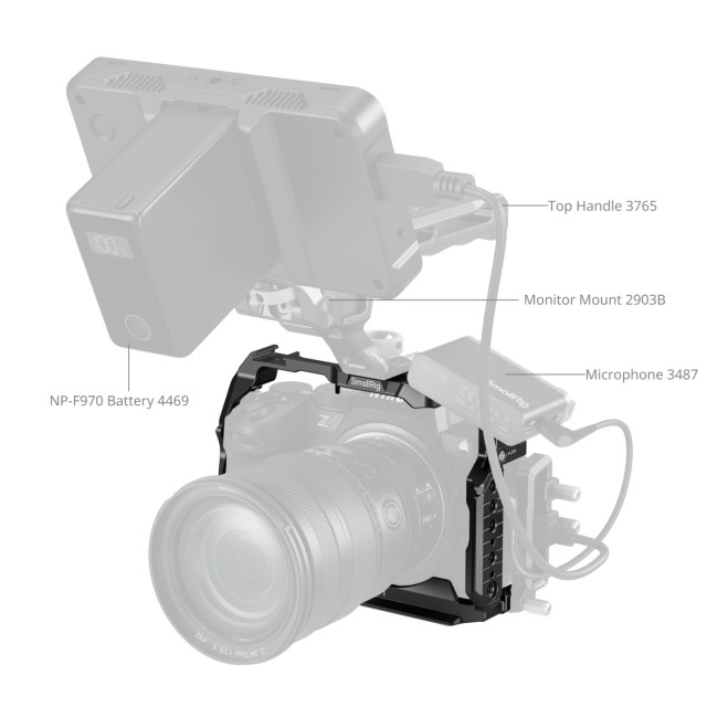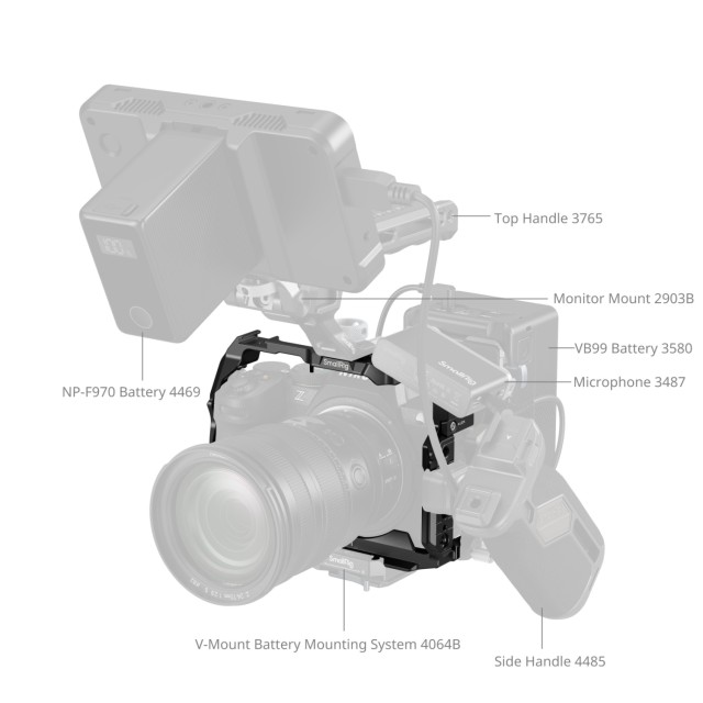 Fel van szerelve 1/4"-20-as menetes furatokkal, 1/4"-20-as rögzítőfuratokkal és 3/8"-16-os menetes furatokkal olyan tartozékok rögzítéséhez, mint az oldalsó fogantyúk (ID 4015) és a felső fogantyúk (ID 3765) a kamera zökkenőmentes mozgatásához, valamint a monitor tartó (ID 2903B), állványok (ID 3989), power bank tartók (ID BUB2336) és mini V-mount akkumulátor lemezek (ID 2987). Az oldalán egy 1/4"-20-as helymeghatározó furat található az egyrudas rögzítők (ID 3598), a varázskarok (ID 3873) és az oldalsó fogantyúk (ID 4346) rögzítéséhez.