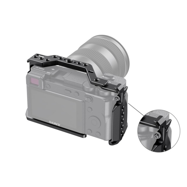 A Sony A6600 CCS2493 modellhez készült SmallRig cage védelmet és rögzítőmenetet biztosít olyan tartozékok számára, mint a monitorok, mikrofonok, lámpák és markolatok. A cage egy 1/4"-20-as alsó csavarral és egy M2,5-es csavarral rögzül a fényképezőgép aljára, hogy megakadályozza a csavarodást. Több 1/4"-20, 3/8"-16 és Arri 3/8"-16 tartozékfurattal van ellátva, amelyek lehetővé teszik a 2165-ös felső markolat, a 2294-es monitortartó és a 2348-as monitortartó felszerelését. Két vakusínt foglal magába, egyet felül, egyet pedig balra a mikrofon és a világítás számára. A cage mindkét oldalán lyukakkal van ellátva a hordozószíj számára. Az alsó részhez laposfejű csavarhúzó jár a gyors beszereléshez. Igény esetén a 1693-as HDMI kábelrögzítő és a 1787-es objektívadapter-tartó külön megvásárolható.