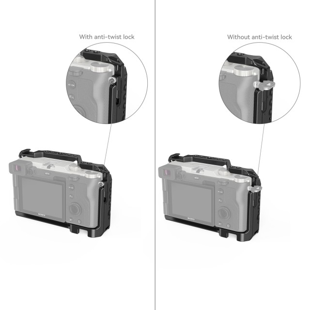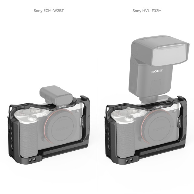 A SmallRig Cage for Sony Alpha 7C 3081B úgy lett kialakítva, hogy rögzítési pontokat biztosítson olyan tartozékok számára, mint a monitorok, mikrofonok és LED-fények a professzionális videókészítés során. A ketrec egy 1/4"-20-as csavarral rögzíthető a kamerához az alján. A csavarodás további megakadályozása érdekében használhatja a jobb oldali zárat is, a csúszka felfelé tolásával és a mellékelt kis csavar rögzítésével a kamera szíjfuratához.