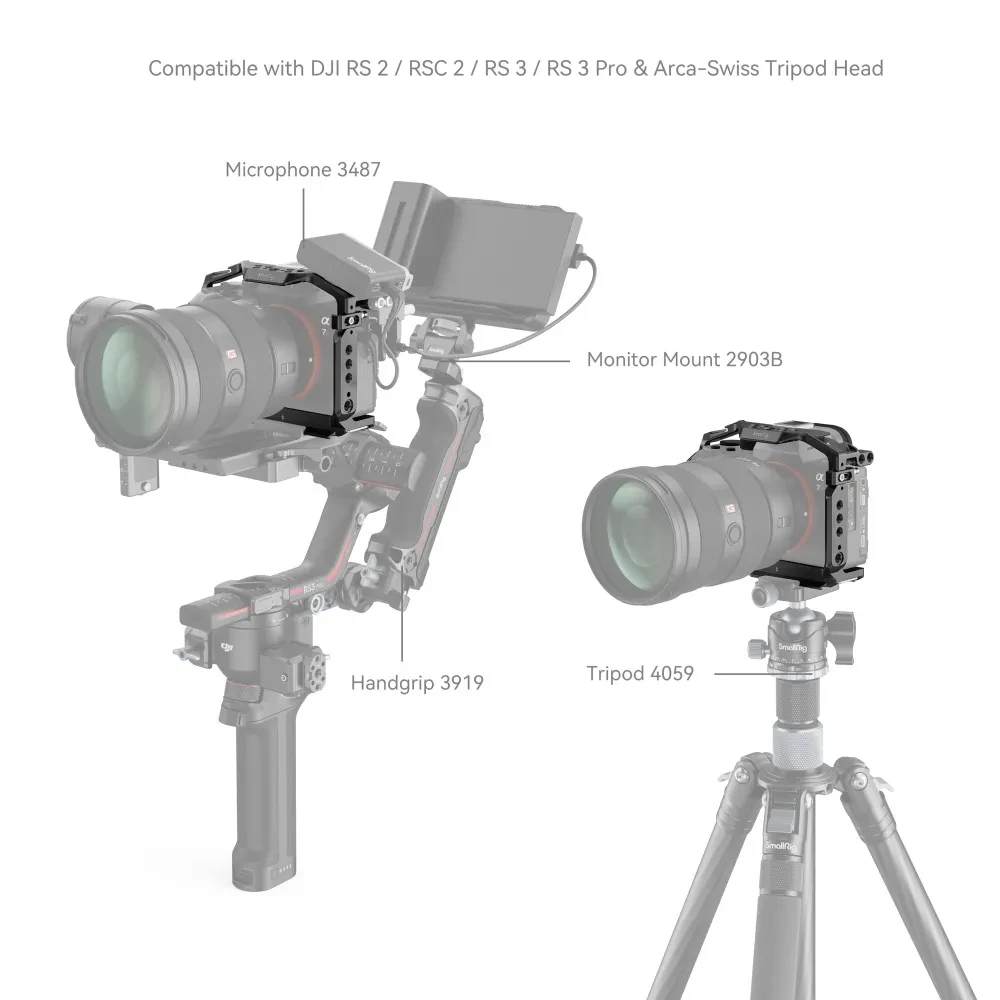 A SmallRig 2087-es A7RIII cage kifejezetten a Sony A7RIII/A7M3/A7III szériához készült. A kamera védelme mellett számos további rögzítési lehetőséget kínál, a jobb felső részén egy vakusaru is található, amelyre mikrofont, egy Magic Arm 1497/1498/2070-et, vagy egy monitort lehet csatlakoztatni. A tetején lévő ARRI menetes furatok kompatibilisek az ARRI pozicionáló csapokkal, akárcsak a 2026-os Magic Arm elfordulásgátló adapterrel, amely 2026 monitorhoz vagy vezeték nélküli képtranszmitterhez csatlakoztatható.