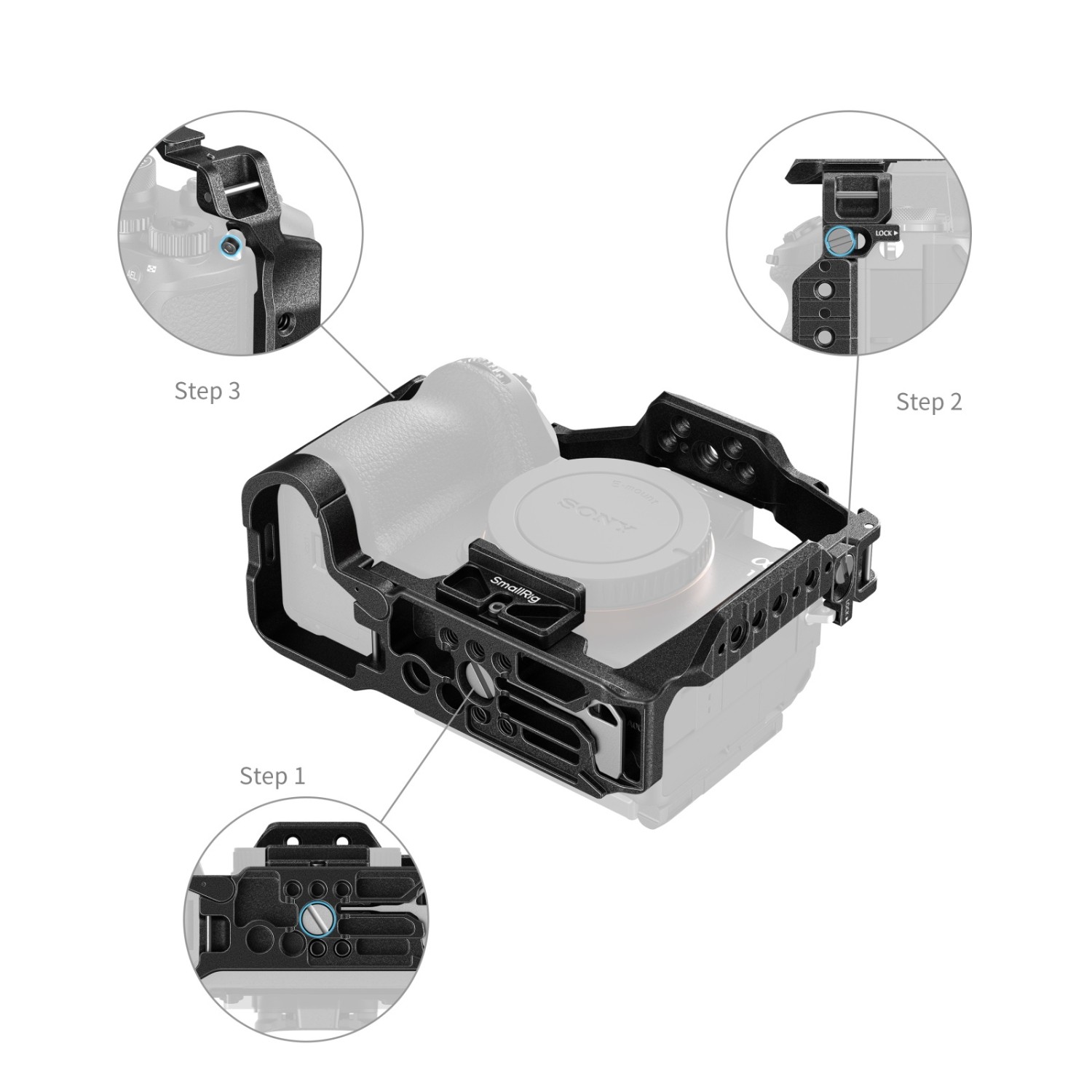 A keret alján egy Arca-Swiss gyorskioldó lemez található, amely közvetlenül rögzíthető Arca típusú állványokhoz (ID 4060) és DJI RS 2 / RSC 2 / RS 3 / RS 3 Pro / RS 4 / RS 4 Pro gimbalokhoz, lehetővé téve a gyors átállást stabilizátor, kézi és állványos beállítások között.