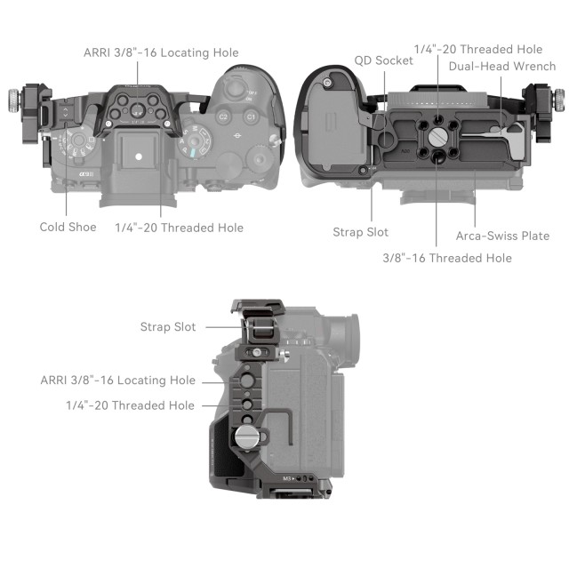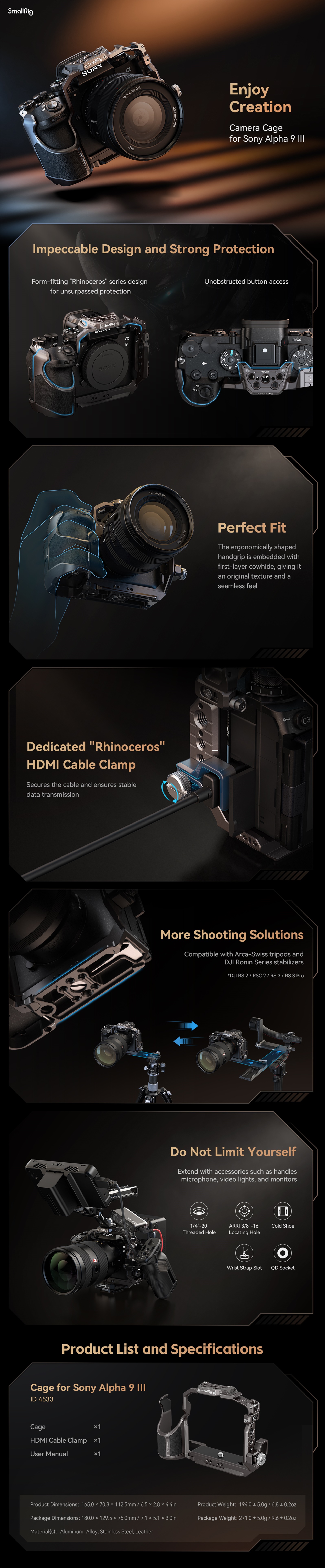 A SmallRig Cage for Sony Alpha 9 III 4533 a kamera védelmét és tartozékokkal való bővítését szolgálja. A hárompontos elhajlásgátló reteszelőrendszer szilárdan rögzíti az Alpha 9 III-at a helymeghatározó csapok, egy 1/4"-20-as csavar alul és egy M2,5-es csavar bal oldalon. Az áramvonalas ketrec kialakítása biztosítja a gombok akadálytalan elérését, kényelmesebb használatot biztosítva. A dedikált "Rhinoceros" HDMI kábelrögzítő hüvelykujjcsavarokkal rögzíti a kábeleket, védve a HDMI-portokat és biztosítva a stabil adatátvitelt. A több beépített rögzítő interfész 1/4"-20 furatok és ARRI 3/8"-16 helymeghatározó furatok a felső fogantyú (ID: 2165C) vagy az oldalsó fogantyú (ID: 4016) rögzítéséhez, ARRI 3/8"-16 helymeghatározó furat a monitortartó bővítéséhez (ID: 2903B), hideg cipő mikrofon vagy LED-videólámpa számára, QD aljzat a QD vállpánthoz. Az alján található beépített Arca-Swiss gyorskioldó lemez kompatibilis a DJI RS 2 / RSC 2 / RS 3 / RS 3 Pro, a DJI RS 2 / RSC gyorskioldó lemezzel ellátott stabilizátorral és az Arca-Swiss gyorskioldó lemezzel (ID: 3154). A ketrec bal oldalán és alján található hevederfuratok kompatibilisek a kézi hevederrel (ID: 3848), a vállpánttal (ID: PSC2428) és más tartozékokkal. Emellett a ketrec alján található mágneskulcs bármikor hozzáférhető a könnyű szétszerelés és összeszerelés érdekében.