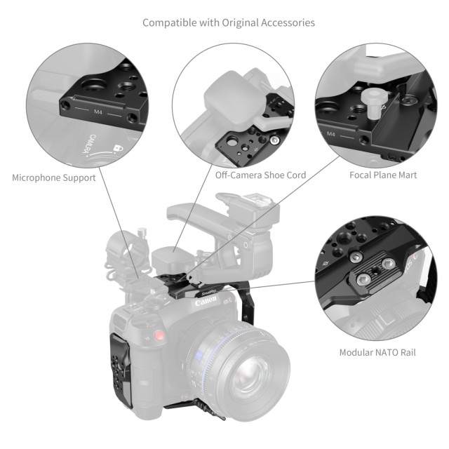 Testreszabhatja Canon EOS C80 felszerelését a SmallRig Cage Kit 5136 segítségével - ez a moduláris ketrecrendszer maximális rugalmasságot és tartozéktámogatást biztosít. Lemezei úgy konfigurálhatók, hogy megfeleljenek mind az állvány, mind a kardán beállításoknak, míg több 1/4"-20 és ARRI 3/8"-16 menetes, NATO sín, hidegcipő rögzítő és QD aljzat széleskörű rögzítési lehetőségeket biztosít. A mellékelt Arca-Swiss gyorskioldó talp, a HDMI kábelrögzítő és a NATO rögzítővel ellátott felső fogantyú egyaránt javítja a használhatóságot és a kezelhetőséget. Az állítható objektívadapter-tartó extra stabilitást biztosít a nehezebb objektívek használatakor, így ez a ketrec robusztus megoldás a professzionális videókészítéshez.