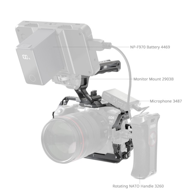 A SmallRig Cage Kit for Canon EOS R6 Mark II 5197 a kézből történő fényképezés javítására készült, jobb hordozhatóságot és tartozékbővítést biztosít. A készlet tartalmaz egy ketrecet, egy USB-C és HDMI kábelrögzítőt, valamint egy kényelmes felső fogantyút a fényképezőgép kényelmes hordozásához és az alacsony szögből történő felvételek készítéséhez.