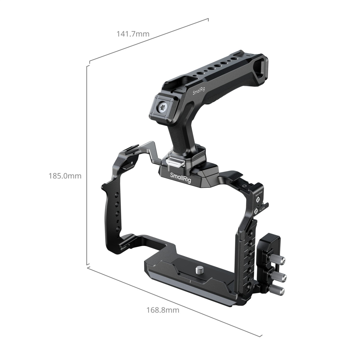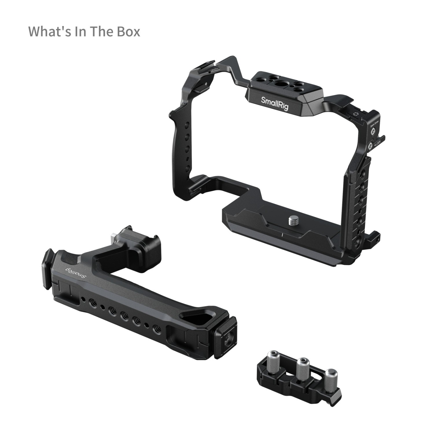 A SmallRig Cage Kit for Panasonic G9 II / S5 II / S5 IIX 5752 kézi felvételek készítéséhez és kiegészítők rögzítéséhez lett kifejlesztve. Tartalmaz egy ketrecet, egy HDMI és USB-C kábelbilincset, valamint egy felső fogantyút, amely ergonómikusan kialakított, hogy javítsa a fogást, és NATO-bilinccsel csatlakozik a ketrechez, míg a csavaros kábelbilincs egyszerre rögzíti a HDMI és USB-C kábeleket. A kiegészítők rögzítési pontjai között a 1/4"-20 menetes furatok a Side Handle 3323 fogantyút támogatják; a hideg cipőfoglalatok az SSD Holder 5196, mikrofon, LED videólámpa, monitor stb. rögzítésére alkalmasak; az ARRI 3/8"-16 rögzítőfuratok pedig a Monitor Mount 2903B monitor tartóhoz illeszkednek. A bal oldalon egy HawkLock H21 NATO sín található a Side Handle 4485-höz, mindkét oldalon pedig hevederfuratok, amelyek kompatibilisek a kézi hevederrel. Ezenkívül a csomagban egy mágneses csavarkulcs is található, amely megkönnyíti a szétszerelést és az összeszerelést.