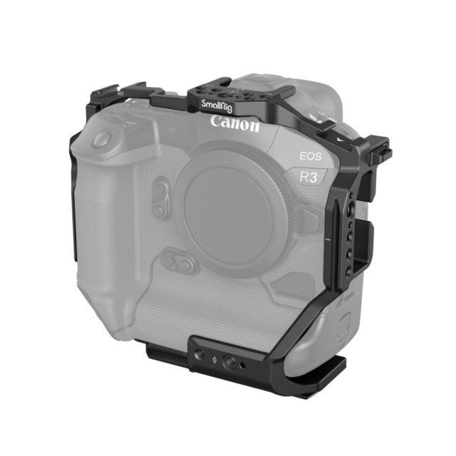 A SmallRig Camera Cage for Canon EOS R3 3884 cage-et úgy tervezték, hogy védelmet és számos rögzítési pontot biztosítson használójának. A kamerát egy 1/4''-20-as csavarral az alján és két oldalsó rögzítő adapterrel mindkét oldalon rögzíti; a cage szilikon párnákkal rendelkezik a karcolások megelőzése érdekében, de közben biztosítja a hozzáférést a gombokhoz, a kártyahelyekhez, az akkumulátor ajtajához és a kihajtható kijelzőhöz. Rendelkezik 1/4"-20-as 3/8"16-os menetes furatokkal a 2165-ös felső, a 1638-as, a 2093-as és a 2425-ös oldalsó markolatokhoz, 2903-as vagy a 2904-es monitortartóhoz vagy a 2115-ös Magic Armhoz. Rendelkezik továbbá 2 vakusínnel mikrofon és/vagy LED lámpa számára. Az alsó és bal oldali Arca-Swiss kompatibilis kialakítású váz könnyen felszerelhető állványra vízszintes vagy függőleges felvételek készítéséhez; Az alsó Arca-Swiss sínnel közvetlenül felszerelhető a DJI RS 2/RSC 2 stabilizátorokra a kézi, állványos és stabilizátoros felvételek gyors megvalósításához. Két elülső 1/4''-20-as menetes furata lehetővé teszi a 942-es Dual 15mm Rod Clamp (dupla rúdrögzítő) rögzítését olyan kiegészítőkhöz, mint a matte box és az objektívtartó, az elülső 1/4''-20-as menetes helymeghatározó furat pedig támogatja a 3276-os 12mm/15mm-es Single Rod Clamp a follow focus elhelyezését. Mindezeken kívül egy integrált laposfejű csavarhúzót is tartalmaz a könnyű össze- és szétszereléshez.