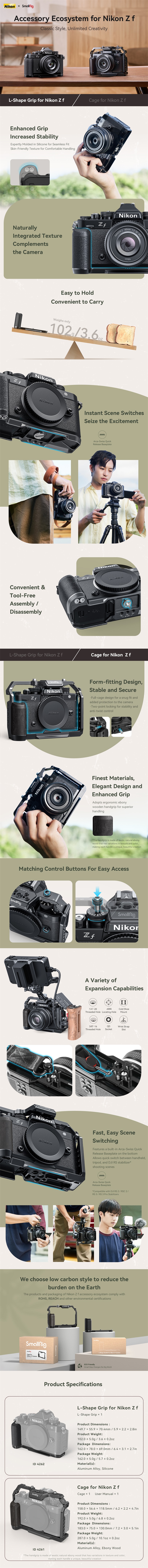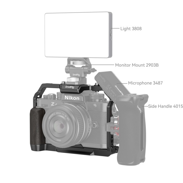 A SmallRig fényképezőgép ketrec Nikon Z f 4261 fényképezőgéphez a fényképezőgép védelmére, a tartozékok rögzítésére és a fogás javítására szolgál. A Nikon Z f-et egy 1/4"-20-as csavarral az alján és egy M2,5-es csavarral a jobb oldalon rögzíti, a karcolásokat megakadályozó gumipárnákkal. A ketrec ébenfa fogantyúval rendelkezik, ergonomikusan kialakított, kényelmes fogást és textúrát biztosít, és teljes hozzáférést biztosít a gombokhoz, a kártyafoglalatokhoz, a flip képernyőhöz és az akkumulátorfedélhez. A tetején osztozik a Nikon Z f elemein és használati élményén. Csak nyomja meg a tárcsát a vezérléshez. A rögzítési pontjai között 1/4"-20 menetes furat, 3/8"-16-os menetes furat, ARRI 3/8"-16-os helymeghatározó furat és hidegcipő-tartó oldalsó fogantyú 2093C / 4016 / 3847, felső fogantyú 3765, monitortartó 2903 / 2904, mini V rögzítésű akkumulátorlemez 2987, egyrudas rögzítő 3598, Magic Arm 3873, mikrofon 3468, LED-videólámpa 4055 stb. Emellett vannak hevederfuratok a 3848 / 3926-os kézi hevederhez, a 3485-ös nyakpánthoz, QD rögzítők a 4118-as vállpánthoz, és egy alsó Arca Swiss gyorskioldó lemez az Arca típusú állványokhoz vagy a DJI RS 2 / RSC 2 / RS 3 / RS 3 Pro kardánokhoz a gyors váltáshoz a kardán, a kézi és az állvány üzemmódok között. A tartozék egyszerű szétszereléséhez és összeszereléséhez egy kétvégű csavarkulcs is jár.