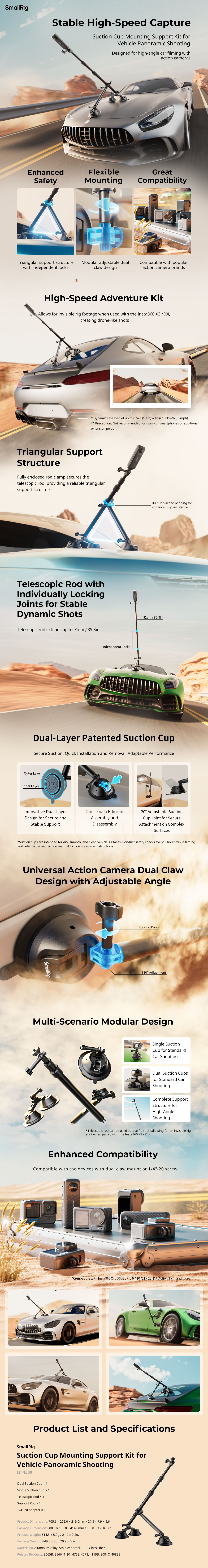 A SmallRig Camera Suction Cup Car Mount Kit for Panoramic Shooting 4380 kifejezetten panorámakamerás autós felvételekhez készült, lehetővé téve az alacsony magasságú drónszerű felvételek készítését. Ez a rögzítőkészlet moduláris felépítésű, és tartalmaz egy kettős tapadókorongot, egy egyszerű tapadókorongot, teleszkópos rudat, tartó rudat és 1/4"-20-as adaptert. A tartós alumíniumötvözetből készült rögzítőkészlet stabilitást és hosszú élettartamot biztosít, és akár 0,5 kg / 1,1 fontot is elbír, így a piacon kapható akciókamerák többségének befogadására alkalmas. A tapadókorongok egyérintéses kialakítása lehetővé teszi a gyors összeszerelést és szétszerelést, míg a szabadalmaztatott, kétrétegű tapadókorong-kialakítás biztonságos és stabil tartást biztosít a felvételkészítéshez. A tapadókorongos csatlakozócsuklók 20°-os állítható tartományával a tartó könnyen rögzíthető ívelt felületekre, így sokoldalú felvételi szögekből készíthet felvételeket.