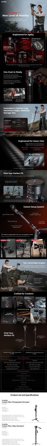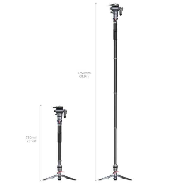 A SmallRig Carbon Fiber Video Monopod 5565 stabil támaszt nyújt a szűk helyeken vagy mozgás közben dolgozó fotósoknak. A tetején egy 1/4"-20-as csavar található a felszerelések csatlakoztatásához és bővítéséhez, míg az alján kettős 1/4"-20-as és 3/8"-16-os csavarok találhatók, amelyek széles körű kompatibilitást biztosítanak a különböző fotó- és videóberendezésekkel. Munkamagassága 1750 mm / 68,9 hüvelyk, így sokféle felvételi igényt kielégít, ugyanakkor összecsukva mindössze 76 cm / 29,9 hüvelyk, így könnyen szállítható, súlya pedig csak 2500 g / 5,51 font. Három 1/4"-20-as rögzítőfurat lehetővé teszi további kiegészítők, például mágikus karok felszerelését.