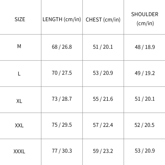 | XXL | 75 / 29.5 | 57 / 22.4 | 52 / 20.5 | 180-185 / 70.9-72.8 |